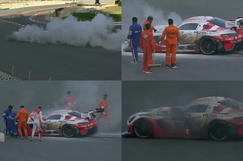 துபாயில் நடைபெற்றுவரும் கார் ரேஸில், அஜித்குமார் ரேசிங் அணியை சேர்ந்த வீரர் அயர்டன் ரெடான்ட் ஓட்டிச்சென்ற கார் தீப்பற்றி எரித்ததால் பெரும் பரபரப்பு ஏற்பட்டது.